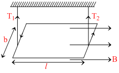 A uniform conducting rectangular loop of sides l, b and mass m carrying current i is hanging horizontally with the help of two vertical strings. There exists a uniform horizontal magnetic field B which is parallel to the longer side of loop. Choose the CORRECT option(s) :-