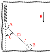 Two identical discs, each of negligible mass and radius r(<<< l) are connected by a uniform rod of mass m and length l as shown in the figure. The disc A is connected with an ideal spring of spring constant k at its centre. The spring is unstretched when θ = 0o. There is no slipping at any contact at any point of time during the motion. Choose the correct statement(s) [Spring always obeys Hook′s Law and mg = k l]. During the motion, each disc remains in contact with the contact surface :-