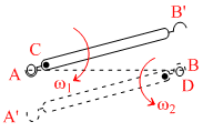 A uniform thin rod AB is equipped at both ends with the hooks shown and is supported by a frictionless horizontal table. Initially the rod is hooked at A to a fixed pin C about which it rotates with a constant angular velocity ω1. Suddenly end B of the rod hits pin D and gets hooked to pin D, causing end A to be released. Determine the magnitude of the angular velocity ω2 of the rod in its subsequent rotation about D. (Assume length and mass of the hook is negligible. Pin C & D are lying on a same horizontal line)