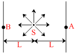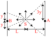 picture, the intensity of light from the source S at point A on a curtain is 8.1 U, where U is some unit. Then we add a big mirror parallel to the curtain at point B. The distances AS and SB are equal, and the points A, S and B are in line, perpendicular to the curtain and the mirror. What is the intensity in U of light reaching point A now ?