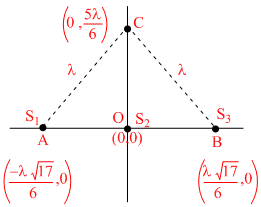 Three coherent sonic sources emitting sound of single wavelength λ are placed on the x-axis at points