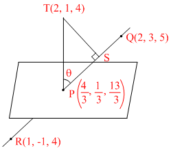 The point P is the intersection of the straight line joining the points Q(2, 3, 5) and R(1, -1, 4) with the plane5x - 4y - z = 1. If S is the foot of the perpendicular drawn from the point T(2, 1, 4) to QR, then the lengthof the line segment PS is