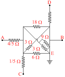 In fig., if a battery is connected between points A and B, e.m.f E = 18 V, the current flowing through the battery is :-