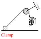A monkey of mass 30 kg is climbing up a rope. The rope is attached with a clamp passing from a pulley. If the clamp can tolerate a maximum vertical force of 180 N. The calculate maximum acceleration of monkey so that clamp can not be cletached from the ground ?