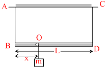 A massless rod is suspended by two identical strings AB and CD of equal length. A block of mass m is suspended from point O such that BO is equal to ′x′ Further, it is observed that the frequency of 1st harmonic (fundamental frequency) in AB is equal to 2nd harmonic frequency in CD. Then, length of BO is :