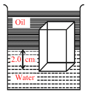 A cubical block of wood of side 10 cm floats at the interface between oil and water as shown in the figure with its lower face 2.0 cm below the interface. The density of oil is 0.5 gm/cm3. The mass of the block is:-