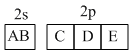 If the spin quantum number of B and E is -1/2. The group of electrons with three same quantum numbers are :-