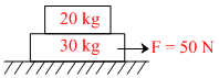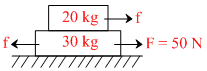 A small block of mass 20 kg rests on a bigger block of mass 30 kg which lies on a smooth horizontal plane. Initially the whole system is at rest. The coefficient of friction between the blocks is 0.5 and a horizontal force of 50 N is applied on the lower block then work done by frictional force on upper block in t = 2 sec is -(surface is smooth )