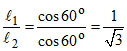 When the capillary is inclined at angle 30o and 60o with the vertical, the lengths of liquid columns inside the capillary are found to be l1and l2 respectively. The ratio of l1 to l2 is :-