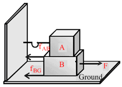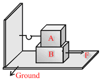 A block A with mass 100 kg is resting on another block B of mass 200 kg. As shown in figure a horizontal rope tied to a wall holds it. The coefficient of friction between A and B is 0.2 while coefficient of friction between B and the ground is 0.3. The minimum required force F to start moving B will be