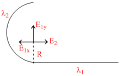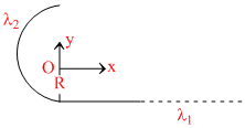 In the figure shown, find the ratio of the linear charge densities λ1(on semi-infinite straight wire ) and λ2 (on semi-circular part), that is, λ1/λ2 so that the field O is along y direction :-