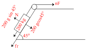 A block of mass 200 kg is being pulled up by men on an inclined plane at angle of 45o as shown. The coefficient of static friction is 0.5. Each man can only apply a maximum force of 500 N. Calculate the number of men required for the block to just start moving up the plane :