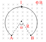 A circular arc carrying current I is placed in uniform magnetic field B as shown in diagram. then force on arc is :-