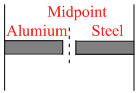 The figure shows two rods, one made of aluminum [α = 23 × 10-6 (Co)-1] and the other of steel [α = 12 × 10-6(Co)-1] Each rod has the same length and the initial temperature. They are attached ay one end to two separate immovable walls. Temperature of both the rods is increased by the same amount, until the gap between the rods vanishes. Where do the rods meet when gap vanishes ?