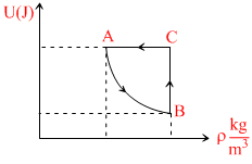 Figure shows the variation of the internal energy U with density ρ of one mole of an ideal monatomic gas for thermodynamic cycle ABCA. Here process AB is a a part of rectangular hyperbola :-