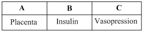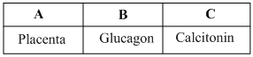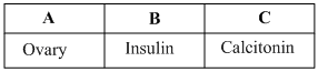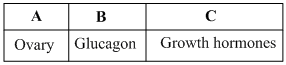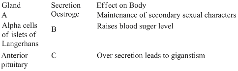 Given ahead is an incomplete table about certain harmones, their source glands and onemajor effect of each on the body in humans. Identify the correct option for the threeblanks A, B and C.