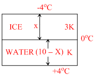 In a 10-meter-deep lake, the bottom is at a constant temperature of 4oC. The air temperature is constant at - 4oC. the thermal conductivity of ice is 3 time that of water Neglecting the expansion of water on freezing, the maximum thickness of ice will be : -