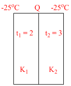 Two plates of equal areas are in contact with each other. Their thickness are 2 cm ans 3cm respectively. Temperature of external surface of first plate is - 25oC and that of external surface of second plate is 25oC What will be temperature of contact surface if the plates :-