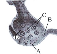 A diagram showing axon terminal and synapse is given. Identify correctly at least two of A-D.