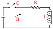 In the circuit shown here, the point ′C′ is kept connected to point ′A′ till the current flowing through the circuit becomes constant. Afterward, suddenly, point ′C′ is disconnected from point ′A′ and connected to point ′B′ at time t = 0. Ratio of the voltage across resistance and the inductor at t = L/R will be equal to