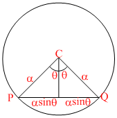P and Q are two points on a circle of centre C and radius α, the angle PCQ being 2θ then the radius of the circle inscribed the triangle CPQ is maximum when -