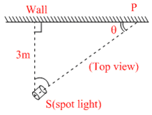 A spot light S rotates in a horizontal plane with a constant angular velocity of 0.1 red /s The spot of light ? P move along the wall at a distance 3 m. What of the velocity spot P when θ = 45o?