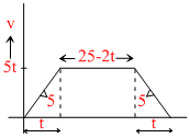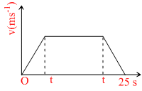 The velocity - time graph of the particle moving along a straight line is shown. The rate of acceleration and deceleration constant and it is equal to 5 ms-2. If the average velocity during the motion is 20 ms-1, then the value of t is
