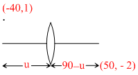 Optic axis of a equiconvex lens is the x - axis. The coordinates of a point object and its image are (-40 cm, 1cm) and (50 cm, -2 cm) respectively. lens is located at -