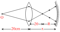 A point object O is placed at a distance of 20 cm from a convex lens of focal length 10 cm as shown in figure. At what distance x from the lens should a concave mirror of focal length 60 cm. placed so that final image coincides with the object -