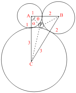 3 circle of radii 1, 2 and 3 and centres at A, B and C respectively, touch each other. An other circle whose centre is P touches all these 3 circles externally and has radius r. Also ∠PAB = θ & ∠PAC = α -
