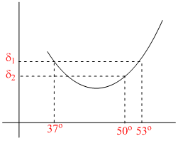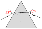 A ray incident at an angle 35o on a prism emerges at an angle 37o as shown. If the angle of incidence is made 50o, which of the following is a possible value of the angle of emergence?