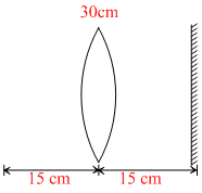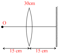 An object O is kept infront of a converging lens of focal length 30 cm behind which there is a plane mirror at 15 cm from the the lens.