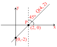 The line PQ whose equation is x - y = 2 cuts the x axis at P and Q is (4, 2). The line PQ is rotated about P through 45o in the anticlockwise direction. The equation of the line PQ in the new position is -