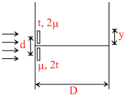 In the YDSE shown the two slits are covered with thin sheets having thickness t & 2t and refractive index 2μ and μ. find the position (y) of central maxima