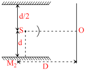 M1 and are plane mirrors and kept parallel to each other. At point O there will be a maxima for wavelength λ. Light from monochromatic source S of wavelength λ is not reaching directly on the screen. Then λ is : [D > > d > > λ]