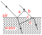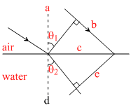 Figure shows plane waves refracted from air water using Huygen′s principle a, b, c, d, e, are lengths on the diagram. The refractive index of water w.r.t air is the ratio.
