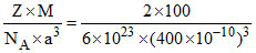 An element (atomic mass = 100 g/mole) having BCC structure has unit cell edge 400 pm. The density of the element is (no. of atoms in BCC(Z) = 2).