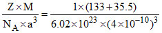 The ionic radii of Cs and Cl are 0.165 nm and 0.181nm respectively. Their atomic weights are 133 and 35.5. Then,