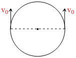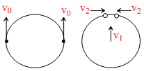 Two particles of mass m, constrained to move along the circumference of a smooth circular hoop of equal mass m, are initially located at opposite ends a diameter and given equal velocities v0 shown in the figure. The entire arrangement is located in gravity free space. Their velocity just before collision is
