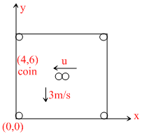 On a smooth board, a coin moving in negative y-direction with a speed of 3 m/s is being hit at the point (4, 6) by a striker moving along negative x - axis. The line join centers of the coin and the striker just before the collision is parallel to x - axis. After collision the coin goes into the hole located at that origin. Masses of the striker and the coin are equal. Consider ing the collusion to be elastic, the initial and final speeds of the striker in m/s will be -