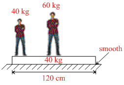 Two men ′A′ and ′B′ are standing on a plank. ′B′ is at the middle of the plank and ′A′ is at the end of the plank. Surface of the plank is smooth. System is initially at rest and masses are as shown in figure A and B starts moving such that the position of B remains fixed with respect to ground then ′A′ meets ′B′. The point where A meets b is located at -