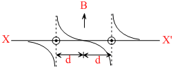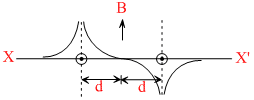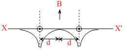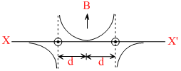 Two long parallel wires are at a distance 2d apart. They carry steady equal current flowing out of the plane of the paper as shown. The variation of the magnetic field along the line XX′ is given by