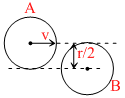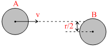 A disk A of radius r moving on perfectly smooth surface at a speed v undergoes an elastic collision with an identical stationary disk B. Find the velocity of the B after collision of the B after collision if the impact parameter is r/2 as shown in the figure