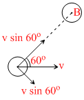 Component of velocity A long common normal is v cos 60o and this velocity of A after collision with A is interchange. Hence A moves along v sin 60o which is normal to common normal