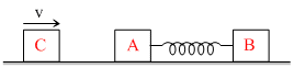 Two blocks A and B each of mass m, are connected by a mass less spring of natural length L and spring of natural length L and spring constant k. The blocks are initially resting on a smooth horizontal floor with the spring at its natural length, the floor with a speed v along the line joining A and B and collides elastically with A. then : -