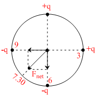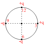 Four charges are place at the circumference of a dial clock as sown in figure. If the clock has only hour hand, then the resultant force on a charge q0 placed at the centre, points in the direction which shows the teems as :-
