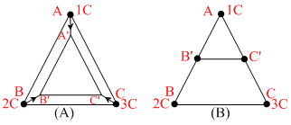 Three point charges 1C, 2C and 3C are placed at the corners of an equilateral triangle of side 1m. The work required to move these charges to the crones of a smaller equilateral triangle of side 0.5 in two different ways as fig. (A) and fig (B) are Wa and Wb then :
