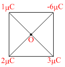 Four charges of 1μC, 2μC, 3μC, and - 6μC are placed one at each corner of the square of side 1m.