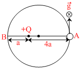 The diagram show a small bead of mass m carrying charge q. The bead can freely move on the smooth fused ring placed on a smooth horizontal plane. In the same plane a charge + Q has also been fixed as shown. The potential at the point A due to + Q is V. The velocity with which the bead could projected from the point A so that it can complete a circle should be greater than :