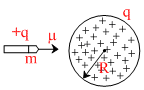 A bullet of mass m and charge q is fired towards a solid uniformly charged sphere of radius R and total charge +q. If it strikes the surface of sphere with speed u, find the minimum value of u so that it can penetrate through the sphere. (Neglect all resistance forces or friction acting on bullet except electrostatic forces)
